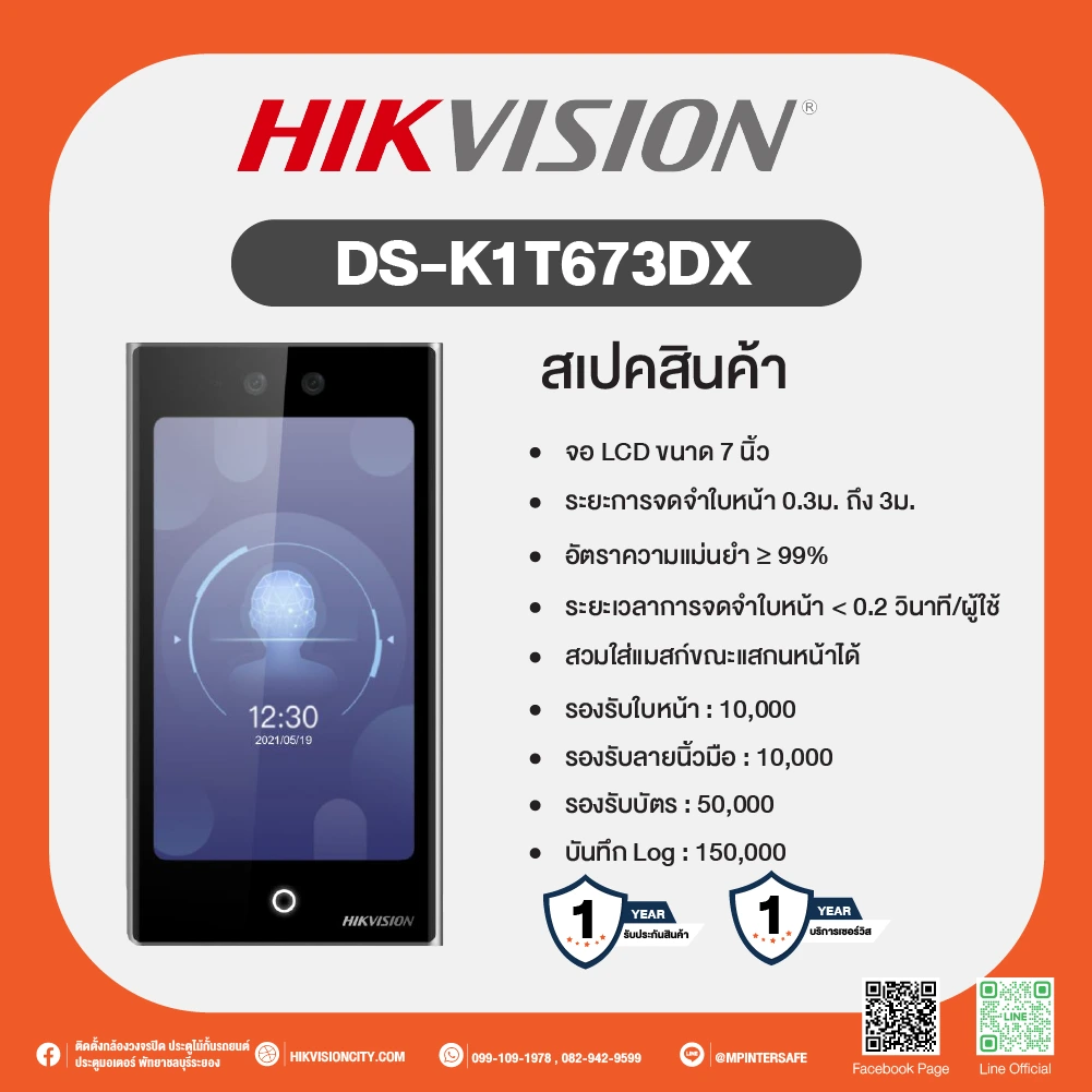 Hikvision รุ่น DS-K1T673DX เป็นอุปกรณ์ Pro Face Access Terminal ที่รองรับการยืนยันตัวตนได้หลายวิธี ได้แก่ ใบหน้า, ลายนิ้วมือ (หากติดตั้งโมดูลเสริม), บัตร M1, DESfire, Felica และ PIN Code โดยมีความแม่นยำสูงถึง 99% และสามารถจดจำใบหน้าได้ภายใน 0.2 วินาทีต่อผู้ใช้ อุปกรณ์นี้มี หน้าจอสัมผัสขนาด 7 นิ้ว (IPS) ความละเอียด 600 × 1024 พร้อมกล้อง 2 MP เลนส์คู่มุมกว้าง รองรับ การตรวจจับใบหน้าแม้สวมหน้ากาก และรองรับ การจดจำหลายคนพร้อมกันสูงสุด 5 คน