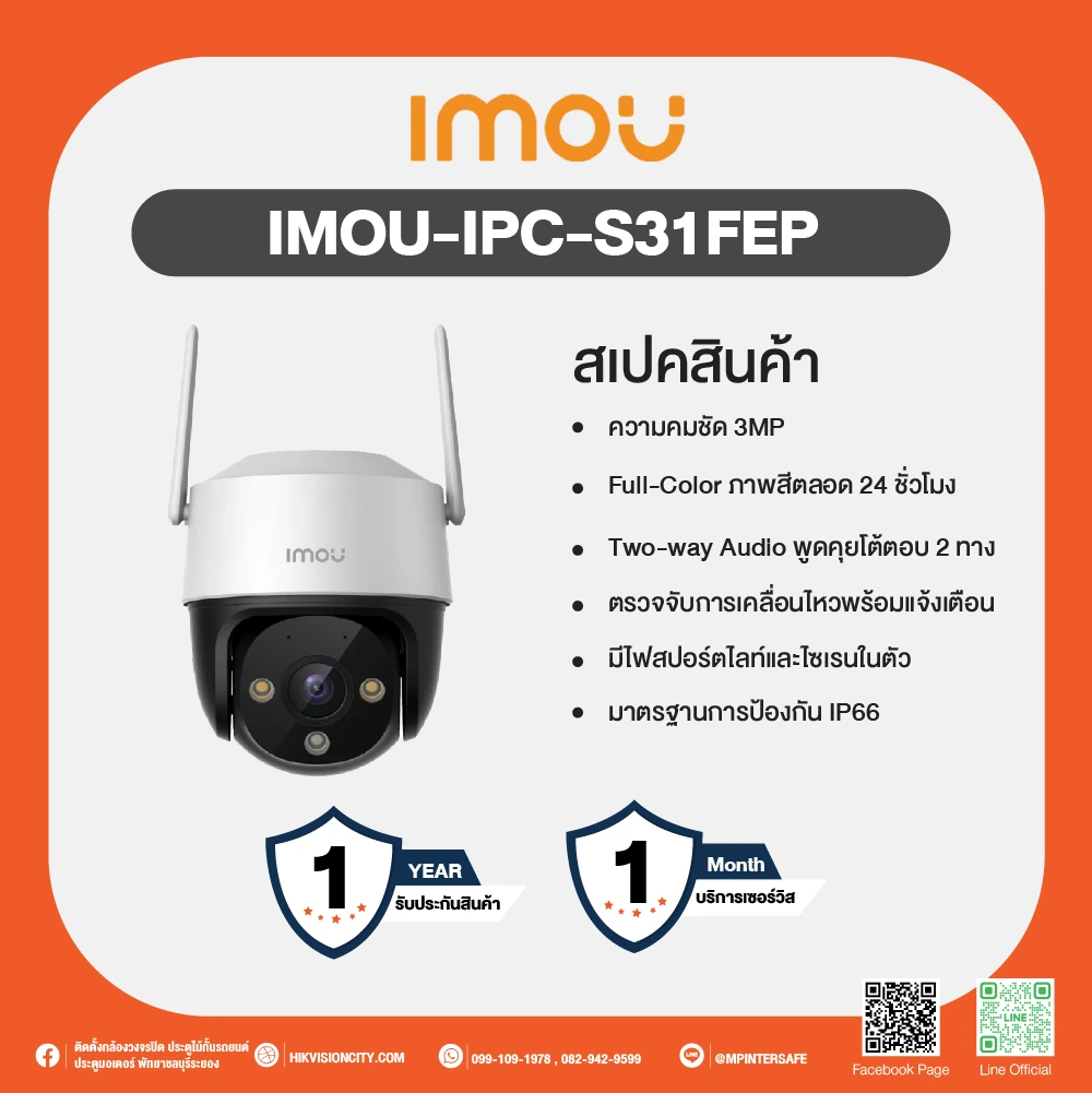 IMOU IPC-S31FEP หรือ Cruiser SE+ 3MP คือกล้องวงจรปิด Wi-Fi คุณภาพสูงที่มาพร้อมความละเอียด 3MP (2304×1296) ให้ภาพคมชัด พร้อมฟังก์ชัน Pan 355° และ Tilt 90° ครอบคลุมทุกมุมบ้าน รองรับการเชื่อมต่อ Wi-Fi 6 และ LAN สำหรับการใช้งานที่ยืดหยุ่น พร้อมไมโครโฟนและลำโพงในตัว รองรับเสียงสนทนาแบบสองทาง พร้อมไซเรนแจ้งเตือนในตัว รองรับการตรวจจับบุคคลอัจฉริยะ (Human Detection) และระบบติดตามอัตโนมัติ (Smart Tracking) รวมถึงมีสปอตไลท์เสริมและวิสัยทัศน์กลางคืน 4 โหมด ที่ช่วยให้มองเห็นชัดในที่มืดถึง 30 เมตร ตัวกล้องทนทานต่อทุกสภาพอากาศด้วยมาตรฐาน IP66 และรองรับการบันทึกผ่าน MicroSD Card ได้ถึง 512GB หรือผ่าน Cloud/NVR ได้เช่นกัน เหมาะสำหรับติดตั้งทั้งในบ้านและกลางแจ้ง เพิ่มความปลอดภัยให้คุณทุกเวลา